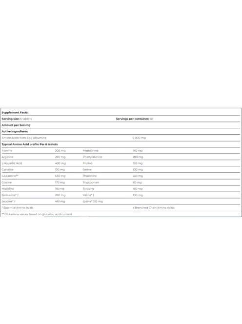 Az Egg Amino 6000 egy speciális aminosav-kiegészítő, amely 1000 mg tiszta tojásalbumint tartalmaz tablettánként. A tojásfehérje egyedülálló profilú aminosavak kiváló forrása.