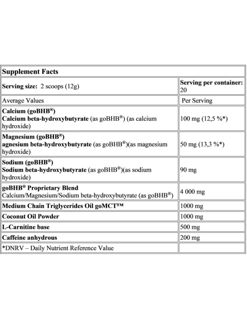 Ajánlott adagolás: Keverj össze 2 adagolókanál (12 g) terméket 250 ml vízzel. Naponta egyszer, reggelente fogyaszd. Összetevők: Fibersol®-2 (emésztésálló maltodextrin), közepes láncú trigliceridolaj goMCT ™ (kókuszolaj; nedvesítőszer: akácmézga; csomósodásgátló: szilícium-dioxid), kókuszolaj (finomított kókuszolaj, maltodextrin, tejfehérje, stabilizátor: nátrium-foszfát , csomósodásgátló: szilícium-dioxid), kalcium-béta-hidroxi-butirát (kalcium-hidroxidként / goBHB® /), magnézium-béta-hidroxi-butirát (magnézium-hidroxidként / goBHB® /), nátrium-béta-hidroxi-butirát (nátrium-hidroxidként / goBHB® /), l-karnitin-bázis, savasság-szabályozó: citromsav; koffein vízmentes, aroma, csomósodásgátló: szilícium-dioxid; édesítőszerek: szukralóz és aceszulfám-K; emulgeálószer: szója-lecitin; festék: karamell. Allergén figyelmeztetés: tojást, glutént, kagylót, diót és földimogyorót felhasználó üzemben készül. Figyelmeztetés: Ha terhes vagy szoptat, kérje egészségügyi szakember tanácsát a termék használata előtt. A terméket nem gyermekek számára tervezték. Gyerekektől távol tartandó. Ne lépje túl az ajánlott napi adagot! Ennek az étrend-kiegészítőnek a fogyasztása előtt javasolt konzultálnia orvosával. Legfeljebb 25 ° C hőmérsékleten, száraz, hűvös helyen, napfénytől távol tárolandó. A terméket ne használd a változatos étrend helyettesítésére. A gyártó és a forgalmazó nem felel a nem rendeltetésszerű használatból vagy tárolásból eredő károkért.