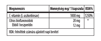 Összetevők: L-aszkorbinsav, citrus bioflavonoid, csipkebogyó kivonat, kapszulahéj: (hidroxi-propil)-metil-cellulóz.
