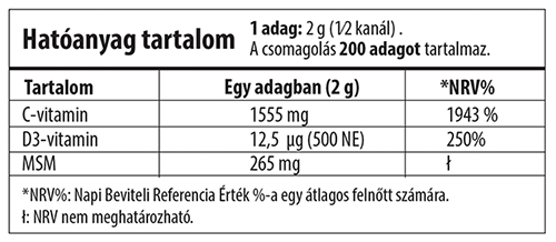 Összetevők: L-Aszkorbinsav, Metil-szulfonil metán (MSM), Aromák, Étkezési sav (citromsav), Édesítőszerek (Szukralóz, Szteviol glikozidok), Kolekalciferol.