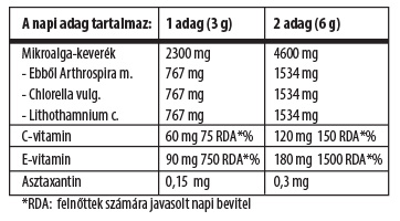 Összetevők: mikroalga porkeverék (Arthrospira maxima, Chlorella vulgare, Lithothamnium calcareum), emulgeálószer (szójalecitin), aszkorbil-palmitát, D-alfa-tokoferol, asztaxantin.