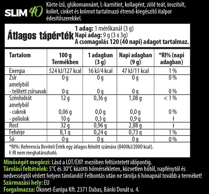 Felhasználási javaslat: Keverjen el egy adag (3 g) Slim40 port 300 ml hideg vízzel és fogyassza háromszor egy nap étkezések előtt.