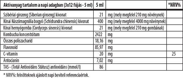 Összetevők: kombucha koncentrátum (víz, cukor, fekete tea, kombucha tenyészet), stabilizátor (glicerin), szárított kínai kúszómagnólia bogyó (Schishandra chinensis) kivonat, csipkebogyó gyümölcslésűrítmény, kökény gyümölcslé sűrítmény, fekete ribiszke gyümölcslé sűrítmény, áfonya gyümölcslé sűrítmény, meggy gyümölcslé sűrítmény, fekete bodza gyümölcslé sűrítmény, fanyarka gyümölcslé sűrítmény, földiszeder gyümölcslé sűrítmény, kékszőlő-héj kivonat, szárított szibériai ginzeng (Siberian ginseng radix conc.) kivonat, szárított bio kínai hernyógomba (Cordyceps sinensis) kivonat, C-vitamin (L-aszkorbinsav), étkezési sav (citromsav).