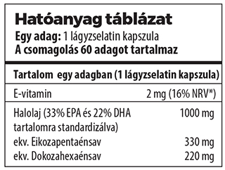 Összetevők: Halolaj (33% EPA és 22% DHA tartalomra standardizálva), Kapszulahéj [Zselatin, Nedvesítőszer (Glicerin), Ivóvíz], DL-alfa-tokoferol.